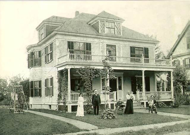The home of Charles A. Daniels was built about 1901 and is shown in this 1904 photograph with the family. Photographed are his wife Anna, her father David Sheldon and her mother Sarah who is holding Anna’s second child, Lorraine. Seated on the steps is Rev. Franklin Chapin, the Congregational Minister. Seated at the right is Charles A. Daniels holding his oldest child Raymond. Once a part of the Gillis Estate this house lot was purchased by Charles A. Daniels in 1901. Charles Daniels was the Hudson Postmaster from 1903 until 1921 and one of the proprietors of Daniels and Gilbert Store at the Bridge. The home remained in the Daniels family until purchased by the family of Robert and Martha Smith in 1949. This building is located at 35 Central Street and is owned by the Smith family and is home to their family business Smith Plumbing and Heating.