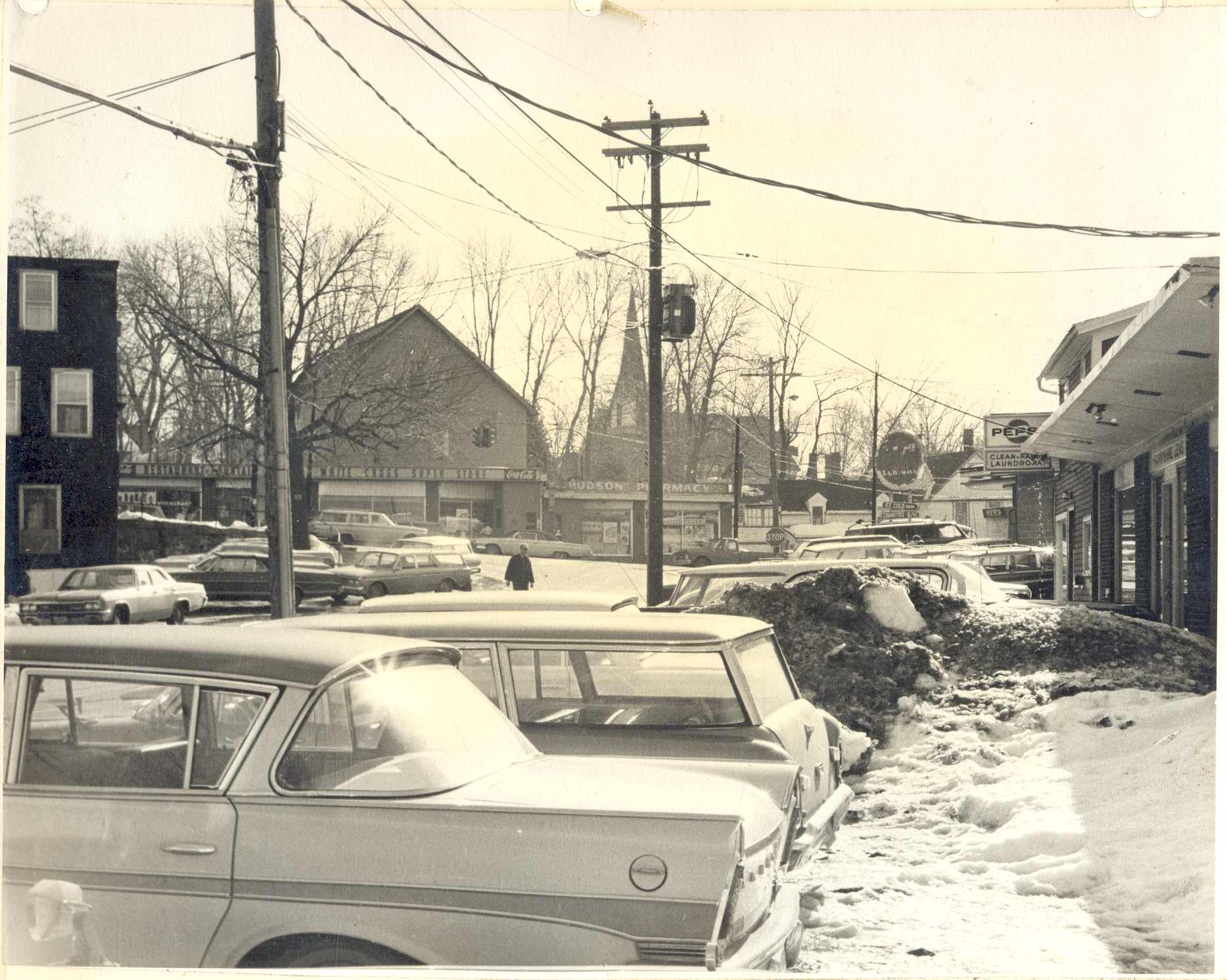 This is a view from Webster Street looking toward Ferry Street circa 1968. Some of your readers will recall The 20th Century Store, White Cross Super Store, Hudson Pharmacy, and the Laundromat. These buildings were efficiently and quickly razed to make access roads for the Veterans Memorial Bridge which now connects Hudson and Nashua. Photo from our collection; photographer Tom Muller. (Published Hudson-Litchfield News (HLN) July 18, 2014.)