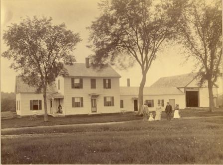 This house was a landmark in Hudson Center for many years; standing at Kimball Hill Road opposite the Hudson Center Common and directly across from the front steps of the Baptist Church. The first occupant was Dr. Paul Tenny who moved to town about 1791 and later settled here. The property was sold to Dr James Emery in 1849. When Dr. Emery retired it was purchased by Henry C. Brown; in 1935 it was purchased by John T. Benson and became part of the Benson’s Wild Animal Farm property. Vera Lovejoy and her family lived here while she was managing the Benson Farm. This c1895 photo shows, left to right, Henry C. Brown; Ina Louise Brown, daughter; Clara Bryant Brown, his wife; and John and Eliza Brown the adoptive parents of Henry. Photo from the Historical Society Collection.
