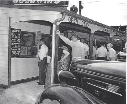 By 1931 Fred T. Goodwin and his wife Annimae had moved to Hudson; and by May of that year Fred , a well known amateur actor, opened a place of business on Derry Road. This was located at what was then the Abbott property and directly across from Saint Patrick’ s Cemetery. He specialized in Ipswich fried clams which he obtained fresh from the flats. Fred. and Annimae had the idea that if they served a good meal at a reasonable price, people would come. And they did! After the first week there were reports that business was so great, many were turned away, and more equipment was quickly added. By 1935 free entertainment to the clam emporium was added in order to attract even more people.