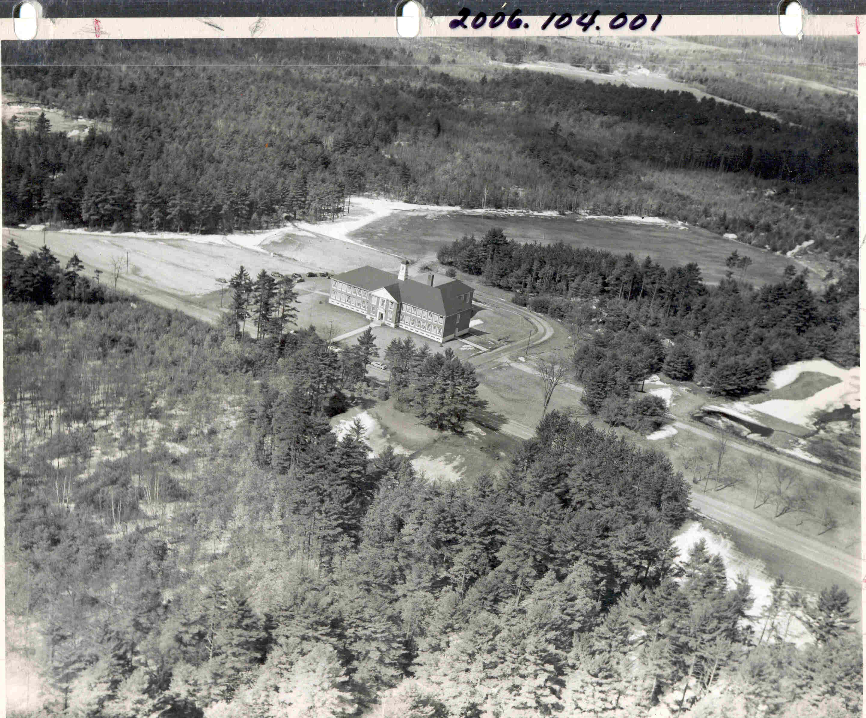 Aerial view of Alvirne School circa 1949-1950. Initially Alvirne housed grades 7 through 12. As population increased Hudson Memorial School was built on Central Street and Alvirne used for grades 9 through 12. The first class to graduate from Alvirne was in 1951. The roadway from the right of the school and running parallel Derry Road leads to the farm pond, barn, and farmhouse. (Published in HLN August 29, 2014.)