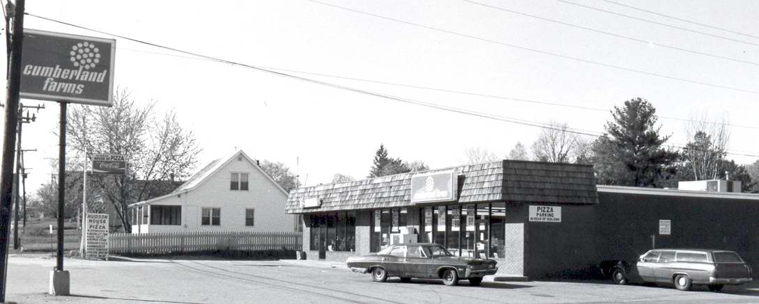 By 1970 a 3-store front building was constructed on this corner and occupied by Cumberland Farms, Anton’s Cleaners, and Russel and Son’s Carpets. Within a few years Anton’s relocated and Cumberland expanded into their space. The carpet place was replaced by Cardinal Reality and later by Hudson House of Pizza. This week’s photo, from the collection of the Historical Society, was taken about 1977 for publication in the history update, Town In Transition. Cumberland Farms and Hudson House of Pizza remained at this location until just a few years ago. This location is now occupied by Veria Pizza and Hudson Mini Mart. Written by Ruth Parker.