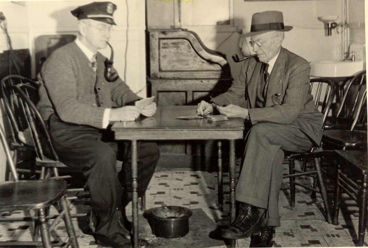 Police and Fire Chief Harry J. Connell (left) and Deputy Harry Emerson spend some idle time in the old police office on Ferry Street. Mr. Connell was a member of the Police Dept. from 1913 and its Chief from 1921 until 1946. He also served as a member of the Fire Dept. from 1912 and its Chief from 1924 until 1946. Mr. Emerson served on the Fire Dept. for over 50 years. He succeeded Mr. Connell as Fire Chief and served in that capacity until 1952. (Published in HLN August 29, 2014.)